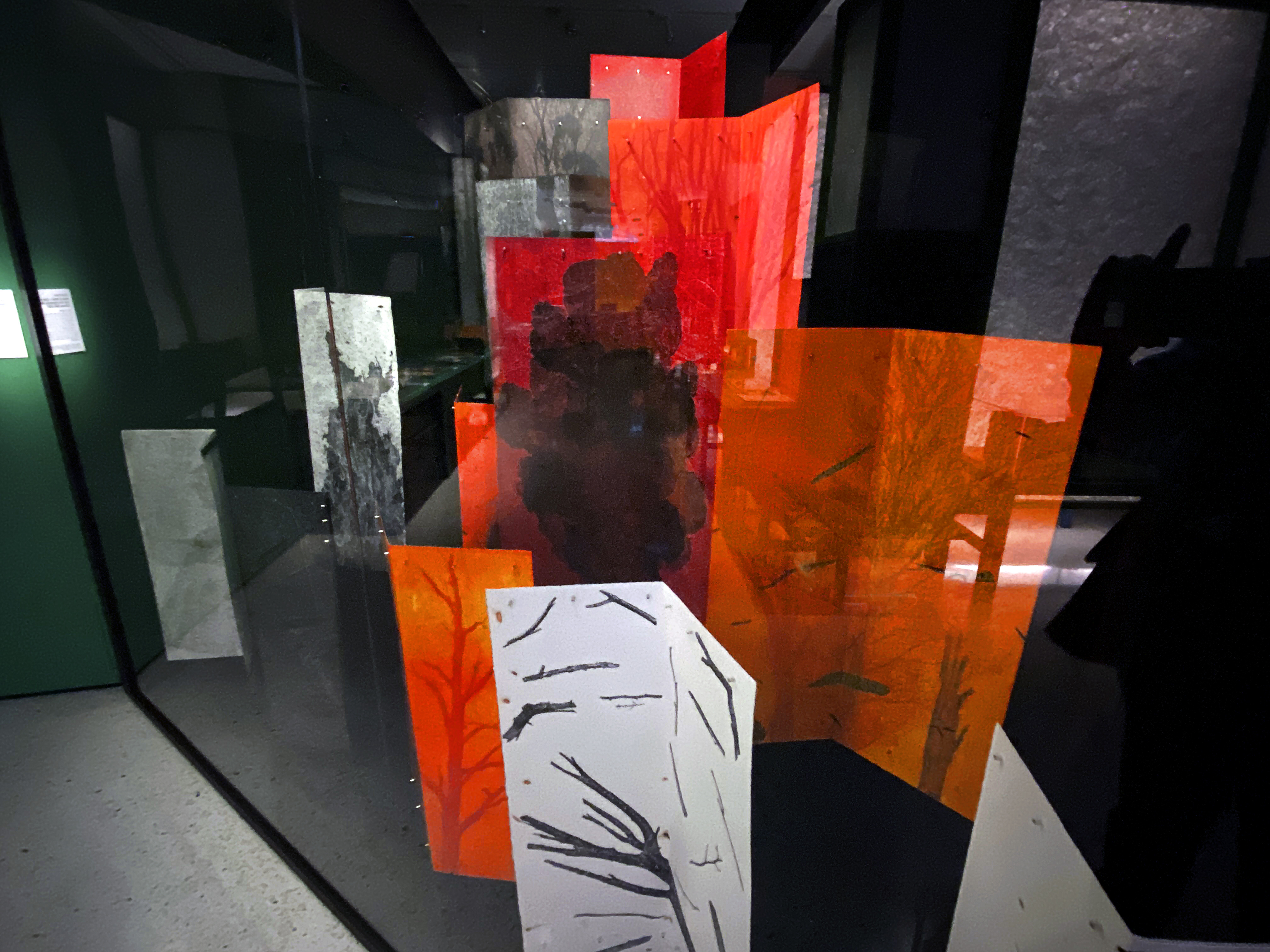 Concertina books are perfectly made for display, extended either framed on a wall or standing upright on a plinth. The bold and colourful Wayzgoose Press book Ockers: a poem by Pi O (1999) is displayed partly opened behind glass. A thoughtful work previously unknown to me was Theo Strasser’s In ecstasy, Franz Kafka (2013) in acrylic painting and collage, based on an aphorism by Kafka. Another is Lossed (2022) by Sara Bowen. Reduction lino prints of her parents, at first strong, becoming lighter as the book is opened page by page. I’m not sure if it represents her memory of them fading or their memories of each other fading through dementia, but it is a very touching work which is displayed to perfection.