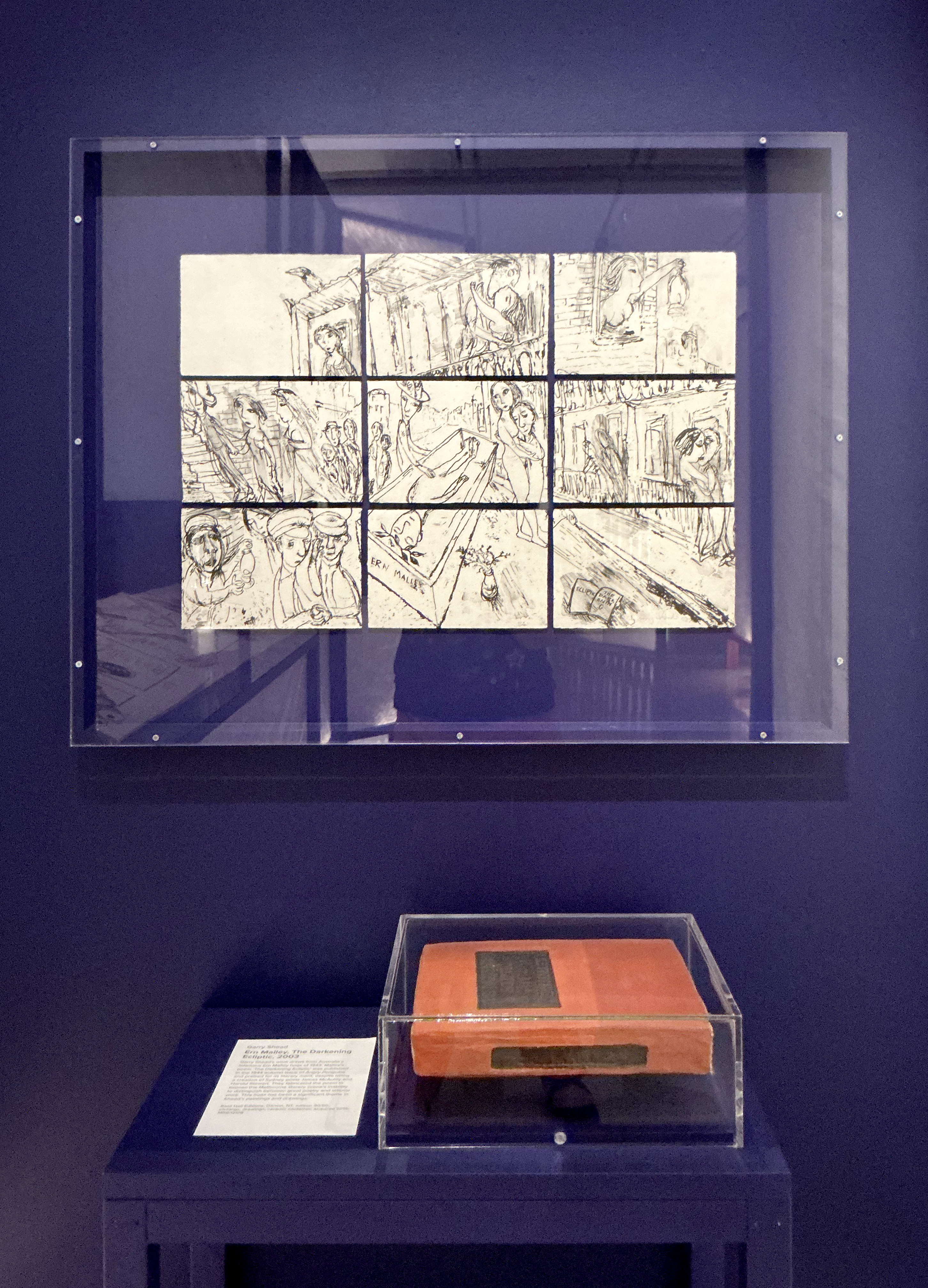 Several of the works have been removed from their covers and are displayed, page by page, on the wall. These include Garry Shead’s Ern Malley: The darkening ecliptic (2003): a sequence of etchings, which when presented together create a single image. Along with the display of the ceramic box in which it was presented, this is possibly the best way to show this work.