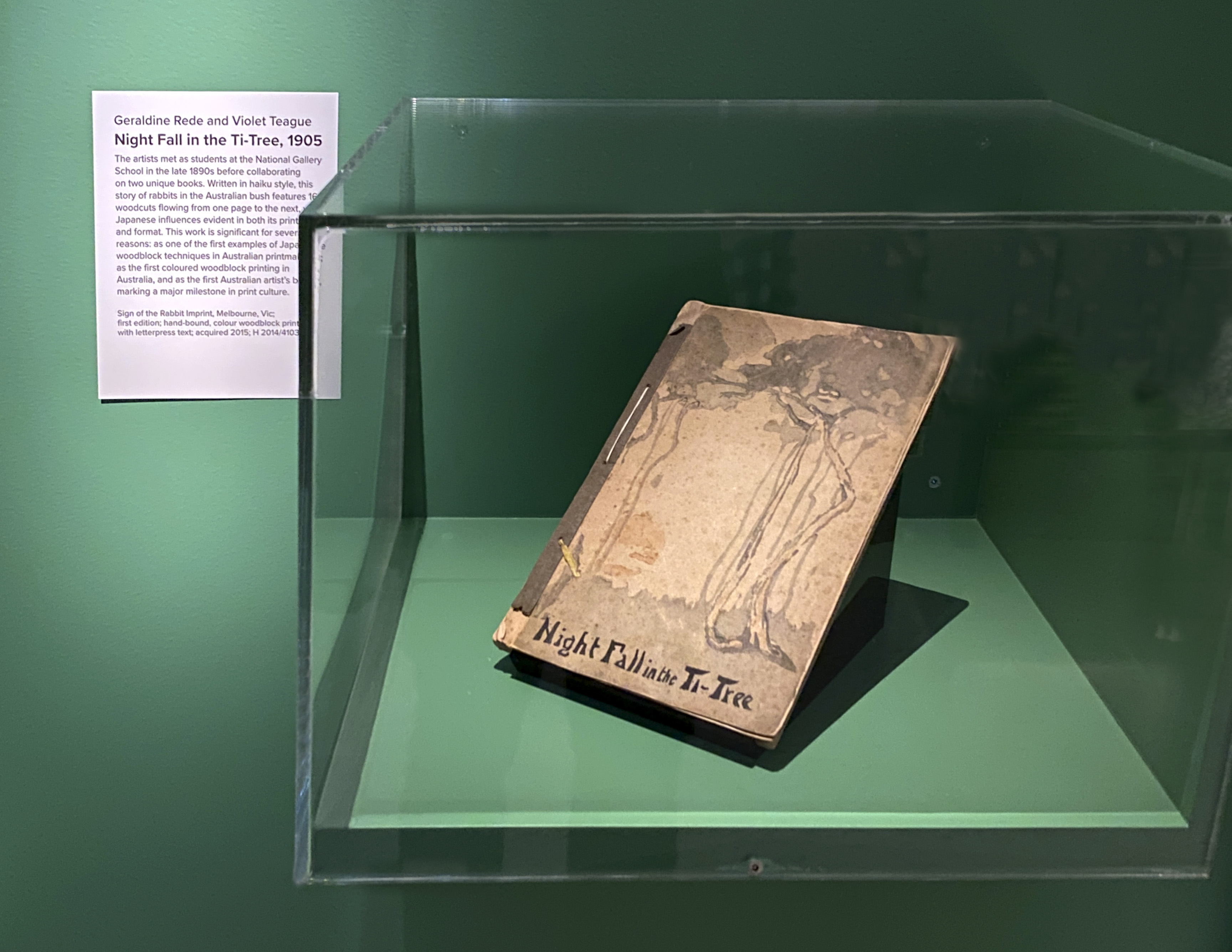 I was surprised that no works from the origins of artists books were shown: books such as those by Picasso and Bonnard published by Ambroise Vollard and Daniel-Henry Kahnweiler in Paris in the early twentieth century. It could be because the library doesn’t hold them. A quick search of the SLNSW catalogue revealed Dingo, with drypoint etchings by Pierre Bonnard published by Vollard in 1924, but few others. I was pleased to see the inclusion of Night fall in the ti-tree (1905) by Violet Teague and Geraldine Rede with its delicate woodcuts, and its acknowledgement as the first Australian artists’ book.