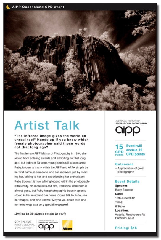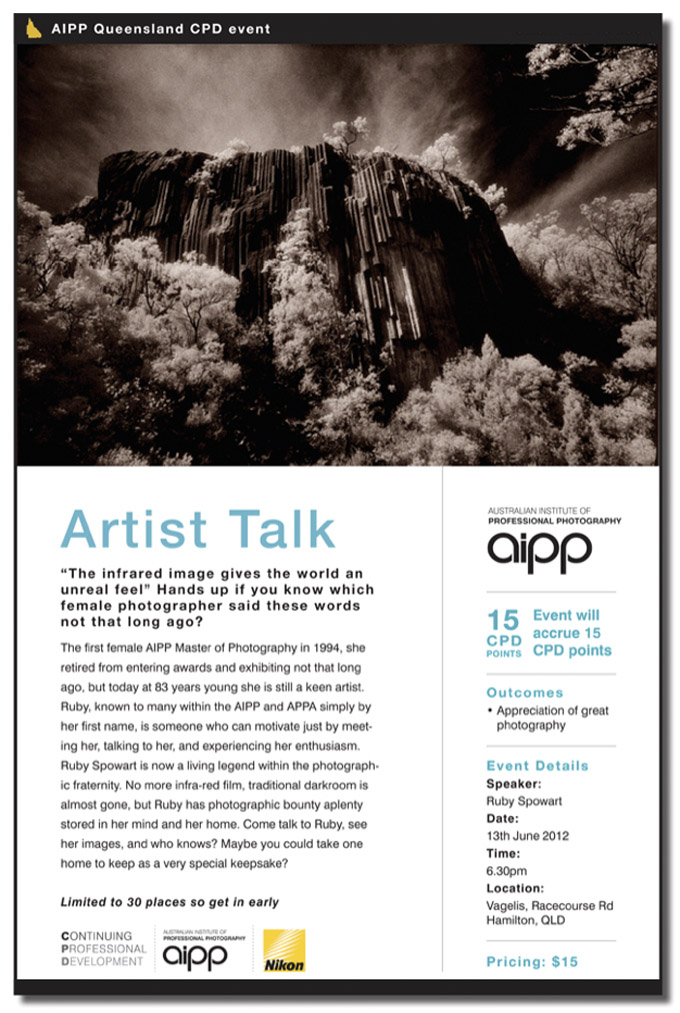 It’s not often that we can gather together and meet with photographers who have been a part of the recent history of the discipline and who in some way may have helped create that space and opportunities that we enjoy today—this occasion was certainly one of these. Thank you to Ruby for sharing her story and her art, to Marianne for her chairing the meeting, thanks also the AIPP Queensland Division and in particular Jan Ramsay for coordinating this and other events for the benefit of AIPP members and those interested in photography.