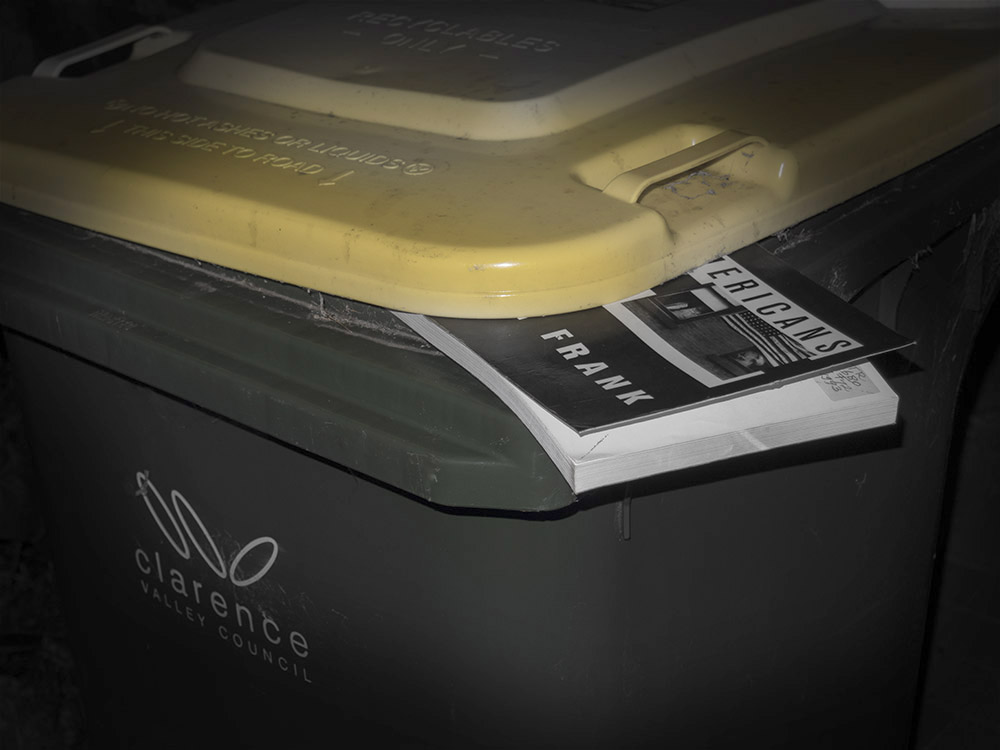 I found Robert Frank’s Americans in my cornflakes packet today. Yesterday I found bits of Irving Penn’s Passage: a work record and Cartier Bresson’s Decisive Moments in my Epson inkjet paper box. And the black and red flecks in the Mercury Cider carton I’d just purchased from Dan Murphy’s where from Trent Parkes’ Dream Life and Robert Holden’s Photography in Colonial Australia: The Mechanical Eye and the Illustrated Book respectively. Whether we like it or not books are slowly and systematically being slipped off the shelves in public libraries and research libraries in institutions across the nation to end up as recycled pulp for new books and boxes and cartons as well as landfill.