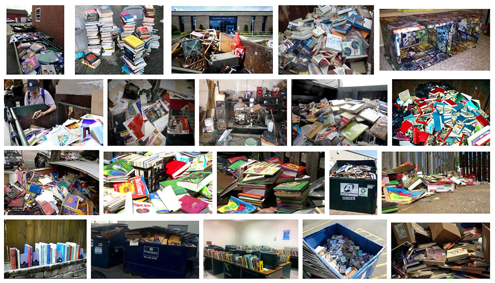 I found it interesting to do a Google search of the terms <books dumped in skips dumpsters> and discovered more instances of the destruction of books. There were many articles about book dumping including one from 2005 in The Guardian reporting the University of London’s Octagon Library dumping stacks of books in skips outside the library. Left to the elements these books, some dating back to the 19th century, were in peril until students and staff rummaged through to salvage what they could. The article quotes author, publisher and campaigner for libraries Tim Coates as saying: