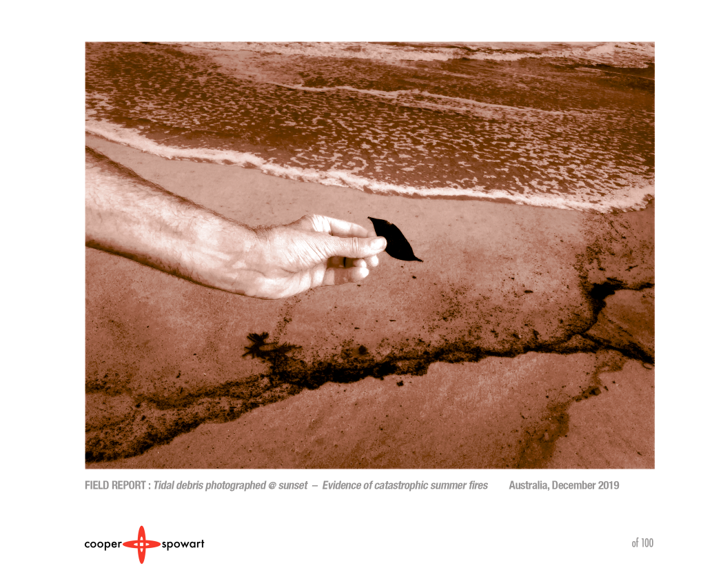 We decided to dedicate our field report work to record this devastation. Our dismay was deepened when we walked along the beach and witnessed lines of leaves and twigs and other blackened material washed up with the tide .. like the dead bodies of victims discarded by criminals. Down the length of the entire coast of NSW where other fires raged, these waves of blackened and broken forests were appearing – the sea has returned the evidence to the place of the crime.