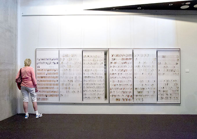 An exhibition visitor is photographed before the artwork Postcards From The Shires …Installation photo: Doug Spowart