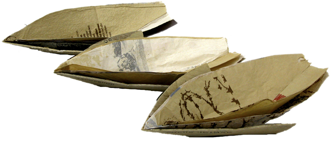 Another book Naru (2007), from the SLQ, was constructed from paper to form a 3D vessel—the book as a metaphor for a boat. The work was the result of a collaborative project entitled Codex Event 4 coordinated by Tim Mosely at Southern Cross University. Naru and the other books that were created by the team have an overtly political statement contained within their shape and the titling. These works comment on idea of the freedom that many people seek as they cross borders as refugees and how this conflicts with the Australian Government’s immigration policies.